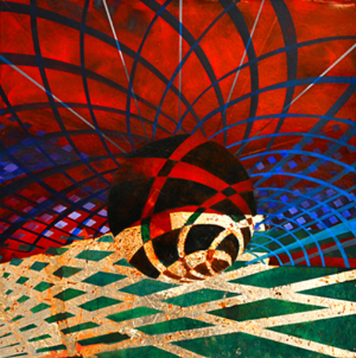 I begin on a black surface in order to create space, which is beyond the world of usual sense perception, and enter directly into a spiritual space of forms, colors, lines and texture. I express geometrical ideas as a grid and juxtapose stenciled elements and forms to create a world of never ending possibilities.
